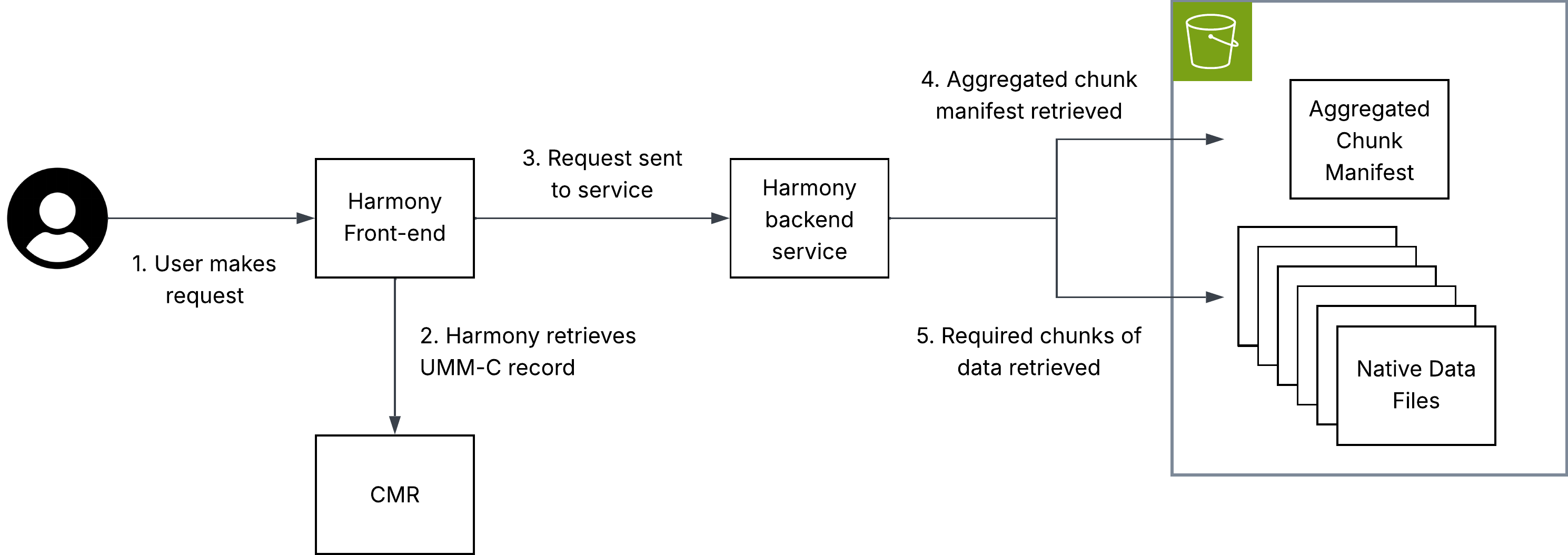 Key to this implementation is that metadata must be hosted in the CMR, allowing Harmony to identify the location of an aggregated chunk manifest. This chunk manifest is read by the Harmony service, allowing it to perform subsetting and only interact with the chunks that are necessary to fulfil the user’s request.